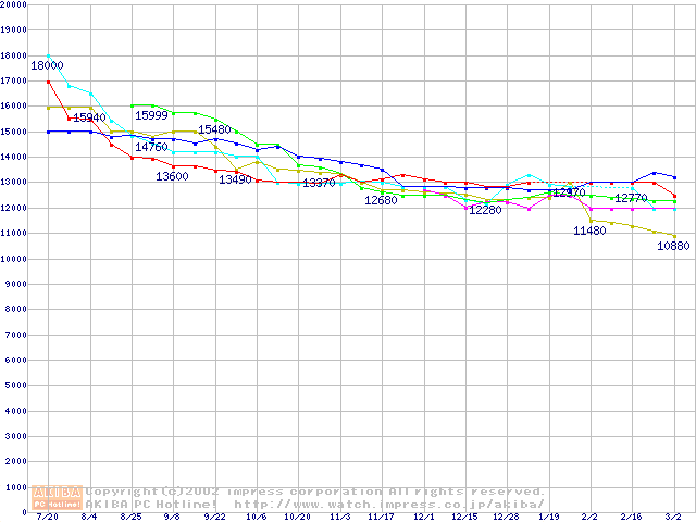 | [↑前グラフ]: | HDD 40GB~50GB未満(5400rpmクラス)の最安値推移 |