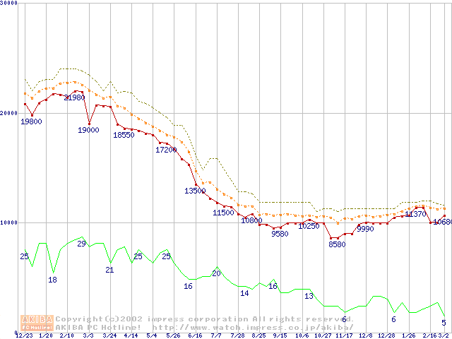 Socket A (Thunderbird,PGA,FSB 200MHz,L2 256KB)の最安値推移