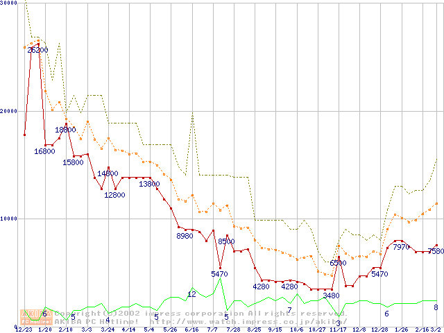PC100 SDRAM DIMM CasLatency=2 ECC対応の最安値推移