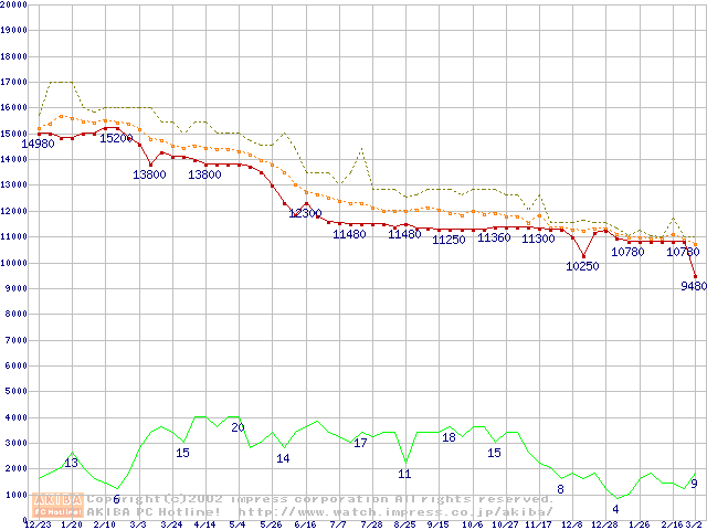 WD Caviar (7200rpm,UltraATA/100,20GB/Platter)の最安値推移
