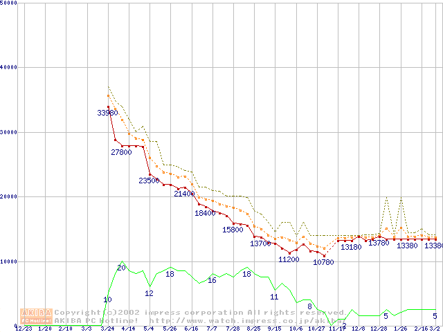 Socket A (Thunderbird,PGA,FSB 200MHz,L2 256KB)の最安値推移