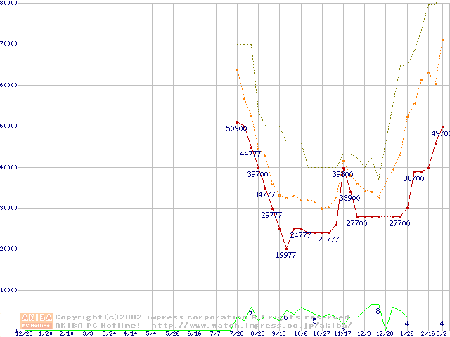 PC133 SDRAM DIMM CasLatency=3 ECC対応 Registeredタイプの最安値推移