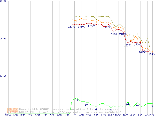 Socket 370 (FC-PGA2,FSB 133MHz,L2 256KB)の最安値推移