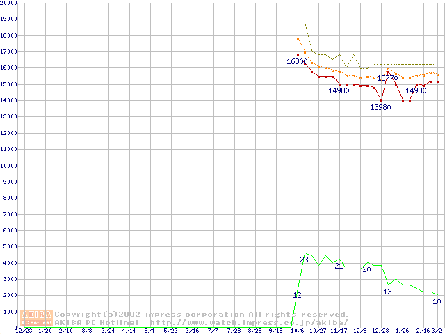 Socket A (Palomino,OPGA,FSB 266MHz,L2 256KB)の最安値推移