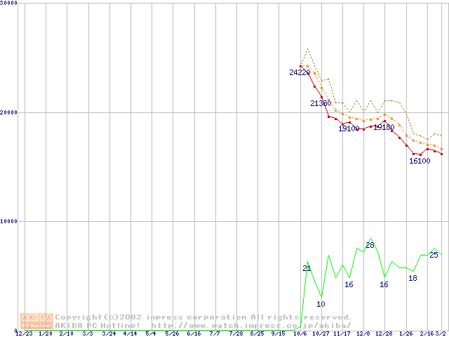 Socket A (Palomino,OPGA,FSB 266MHz,L2 256KB)の最安値推移