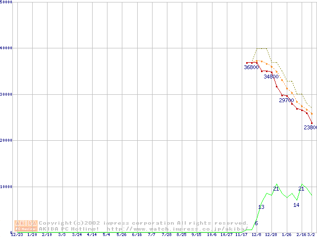 Travelstar 40GN (9.5mm,4200rpm,UltraATA/100,20GB/Platter,2MB,流体軸受)の最安値推移