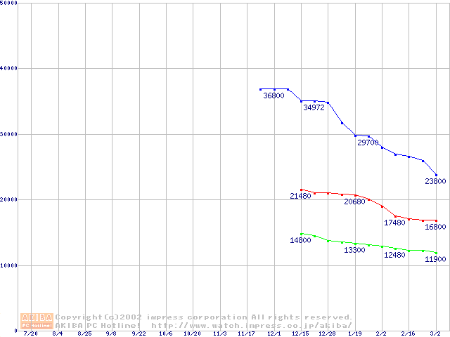 | [↑前グラフ]: | Travelstar 48GH (12.5mm,5400rpm,UltraATA/100,2MB,流体軸受)の最安値推移 |