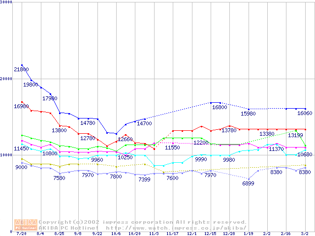| [↑前グラフ]: | Socket A (Thunderbird,PGA,FSB 266MHz,L2 256KB)の最安値推移 |