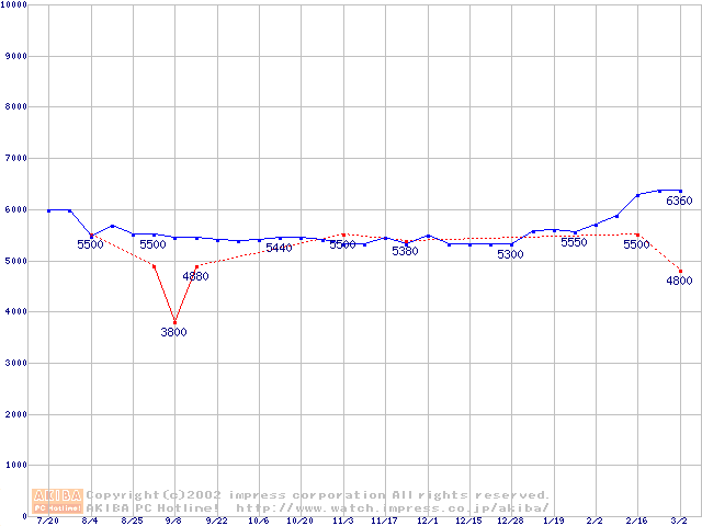 | [↑前グラフ]: | Socket 370 (FC-PGA,FSB 100MHz,L2 128KB)の最安値推移 |