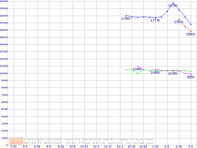 | [↓次グラフ]: | DiamondMax D540X (5400rpm,UltraATA/100,40GB/Platter)の最安値推移 |