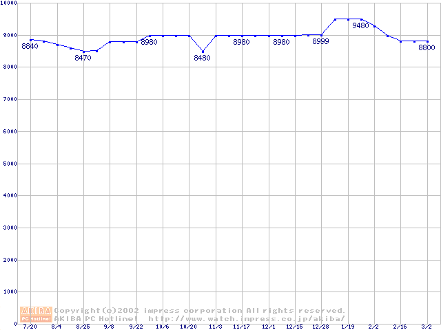 | [↑前グラフ]: | DiamondMax 536DX (5400rpm,UltraATA/100,33.3GB/Platter)の最安値推移 |