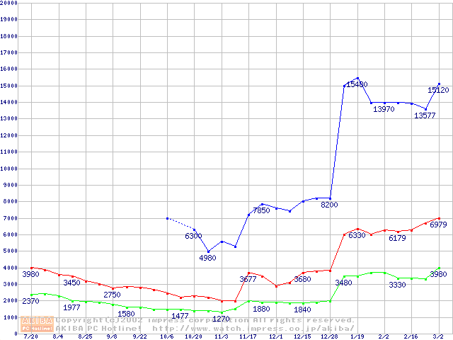| [↓次グラフ]: | PC133 SDRAM DIMM CasLatency=3 ECC対応の最安値推移 |