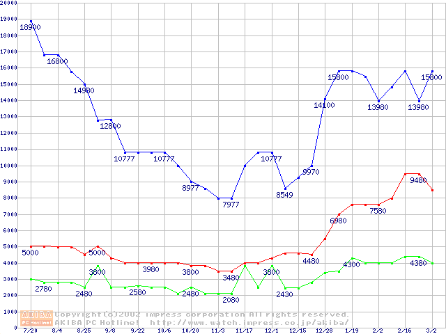 | [↑前グラフ]: | PC133 SDRAM DIMM CasLatency=2の最安値推移 |
