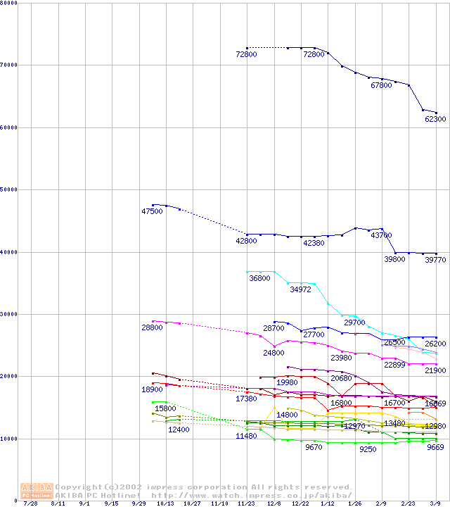 2.5インチHDD主要製品(最安値1万円未満)の最安値推移