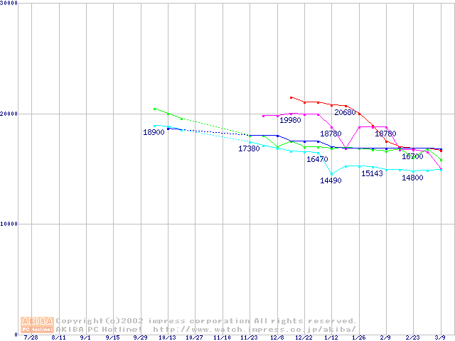 | [↑前グラフ]: | 2.5インチHDD 20GB~30GB未満(9.5mm厚)の最安値推移 |