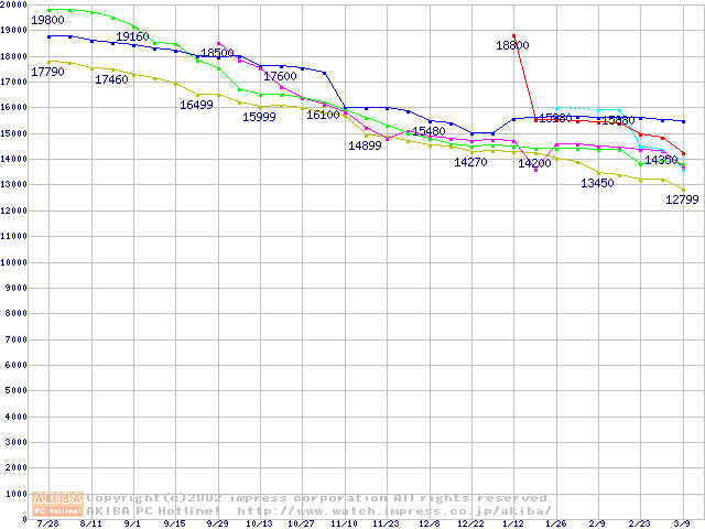 | [↑前グラフ]: | HDD 40GB~50GB未満(7200rpmクラス)の最安値推移 |