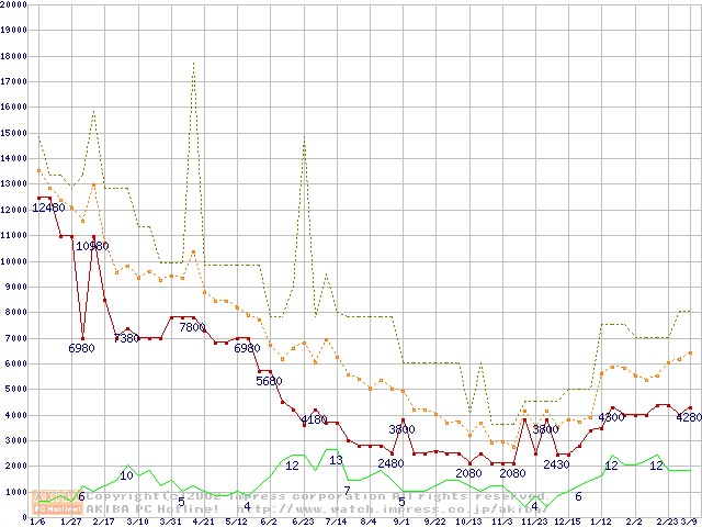 PC133 SDRAM DIMM CasLatency=3 ECC対応の最安値推移