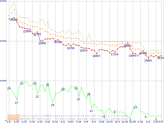 Socket 370 (FC-PGA,FSB 100MHz,L2 256KB)の最安値推移