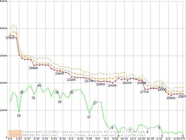 Socket 370 (FC-PGA,FSB 133MHz,L2 256KB)の最安値推移