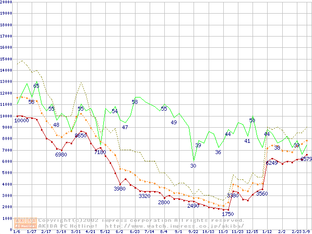 PC100 SDRAM DIMM CasLatency=2の最安値推移