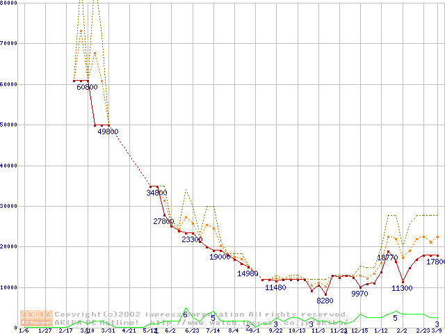 PC100 SDRAM DIMM CasLatency=2 ECC対応の最安値推移