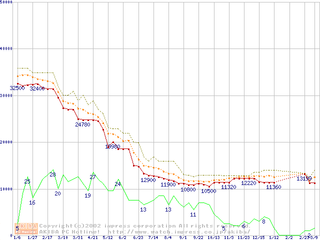 Socket A (Thunderbird,PGA,FSB 200MHz,L2 256KB)の最安値推移