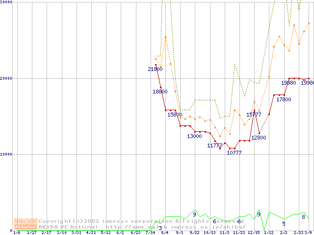 PC133 SDRAM DIMM CasLatency=3 ECC対応 Registeredタイプの最安値推移