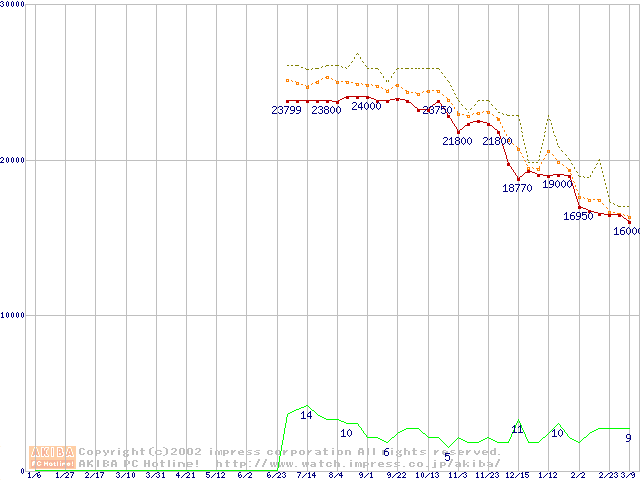 Socket 370 (FC-PGA2,FSB 133MHz,L2 256KB)の最安値推移