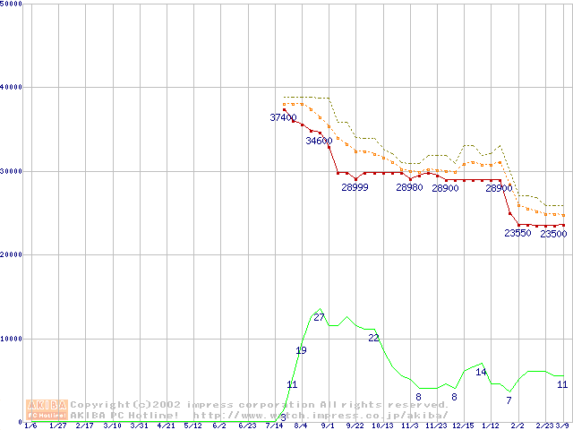 Socket 370 (FC-PGA2,FSB 133MHz,L2 256KB)の最安値推移
