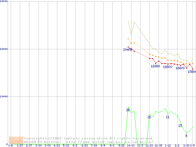 Travelstar 30GN (9.5mm,4200rpm,UltraATA/100,2MB,流体軸受)の最安値推移