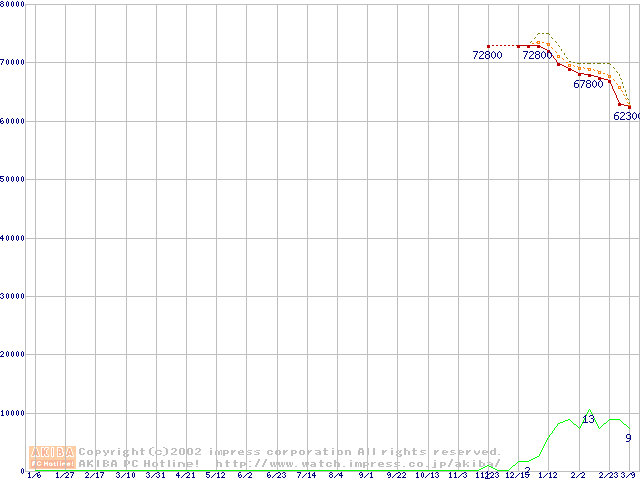 Travelstar 60GH (12.5mm,5400rpm,UltraATA/100,15GB/Platter,2MB,流体軸受)の最安値推移