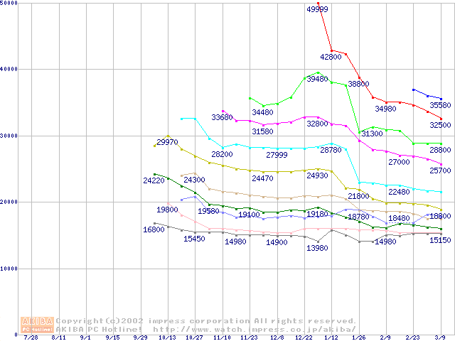 Socket A (Palomino,OPGA,FSB 266MHz,L2 256KB)の最安値推移