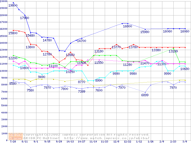 | [↑前グラフ]: | Socket A (Thunderbird,PGA,FSB 266MHz,L2 256KB)の最安値推移 |