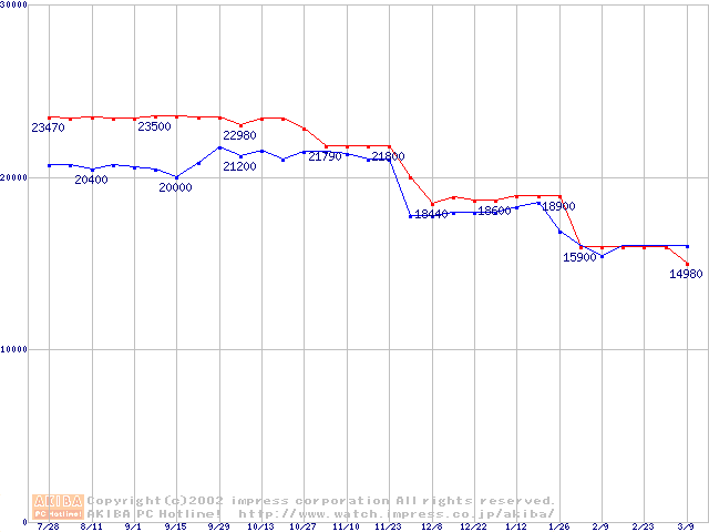 | [↑前グラフ]: | Socket 370 (FC-PGA2,FSB 133MHz,L2 256KB)の最安値推移 |