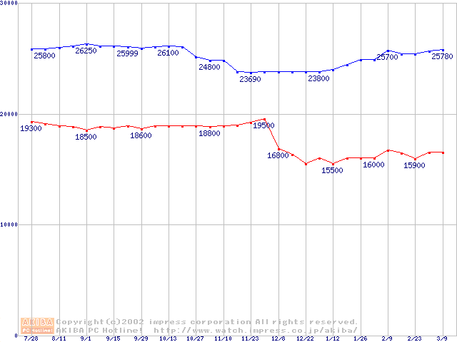 | [↑前グラフ]: | Slot 1 (SECC2,FSB 133MHz,L2 256KB)の最安値推移 |