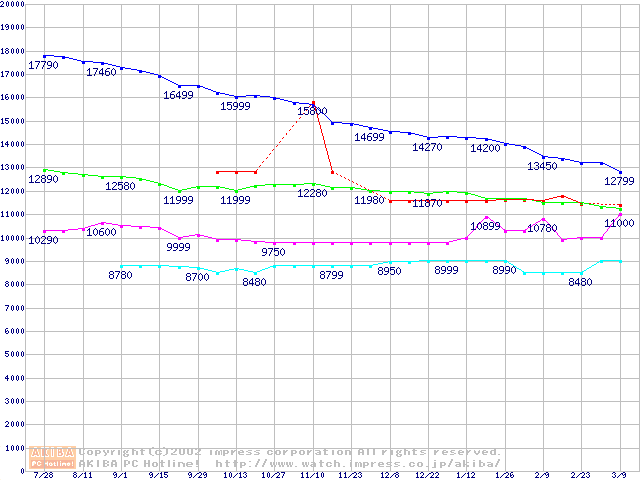 | [↑前グラフ]: | Deskstar 120GXP (7200rpm,UltraATA/100 2MB)の最安値推移 |