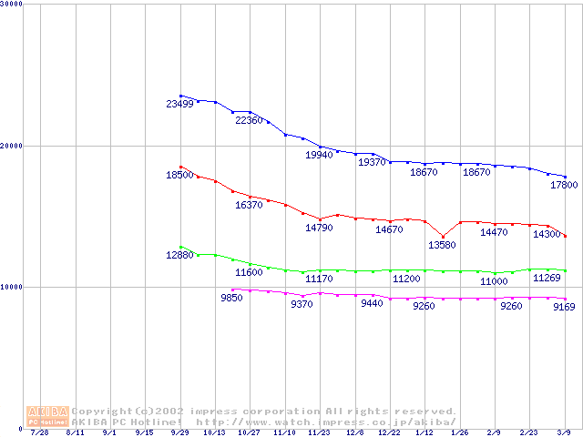 | [↑前グラフ]: | DiamondMax Plus D740X (7200rpm,UltraATA/133,40GB/Platter,流体軸受)の最安値推移 |