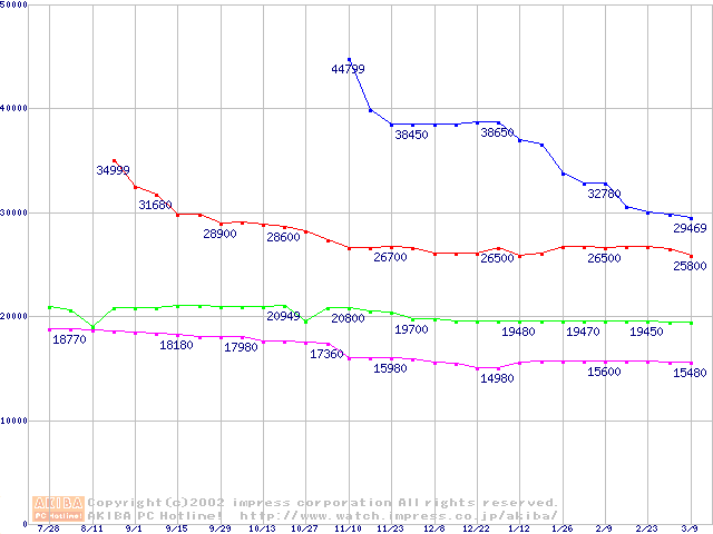 | [↓次グラフ]: | WD Caviar (7200rpm,UltraATA/100,20GB/Platter)の最安値推移 |