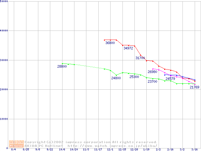 | [↑前グラフ]: | 2.5インチHDD 30GB~40GB未満(9.5mm厚)の最安値推移 |