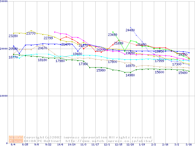 HDD主要製品(最安値1万5千円~2万円未満)の最安値推移