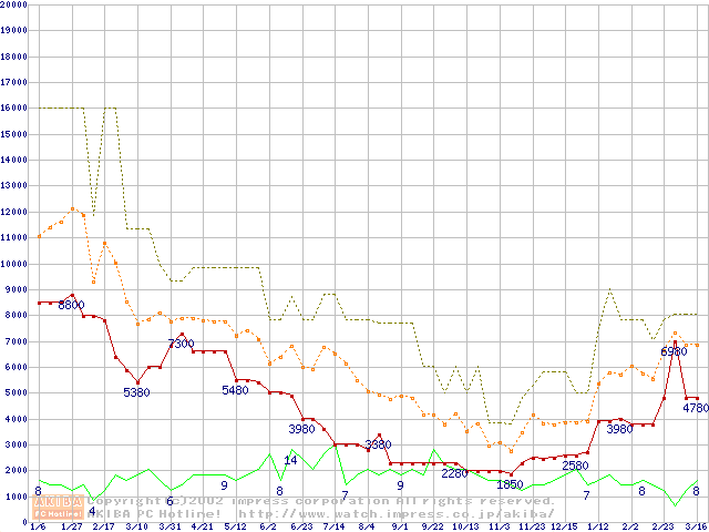 PC100 SDRAM DIMM CasLatency=2 ECC対応の最安値推移