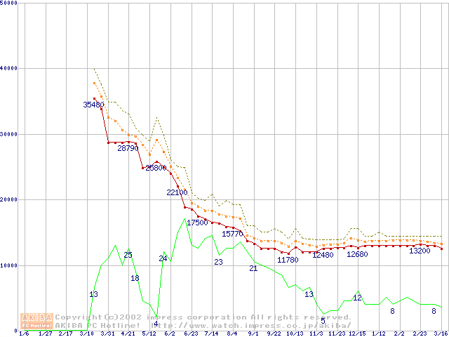 Socket A (Thunderbird,PGA,FSB 266MHz,L2 256KB)の最安値推移