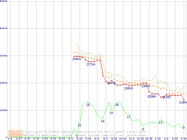 Socket A (Palomino,PGA,FSB 266MHz,L2 256KB)の最安値推移