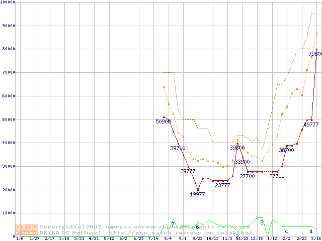 PC133 SDRAM DIMM CasLatency=3 ECC対応 Registeredタイプの最安値推移
