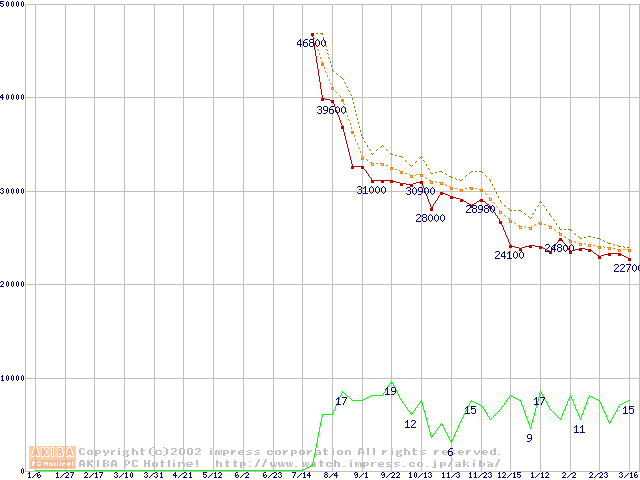 Socket 370 (FC-PGA2,FSB 133MHz,L2 512KB)の最安値推移