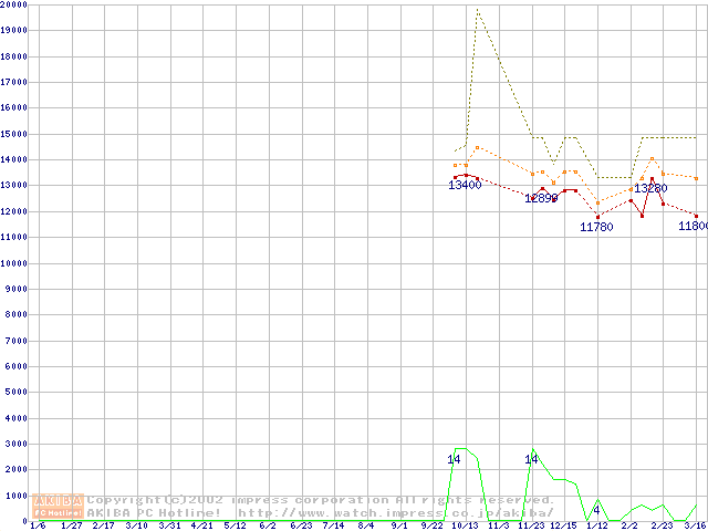 Travelstar 20GN (9.5mm,4200rpm,UltraATA/66,2MB/512KB/256KB)の最安値推移