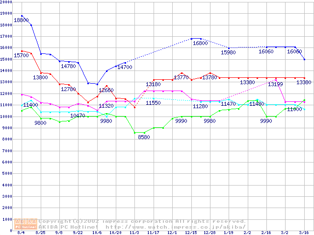 | [↑前グラフ]: | Socket A (Thunderbird,PGA,FSB 266MHz,L2 256KB)の最安値推移 |