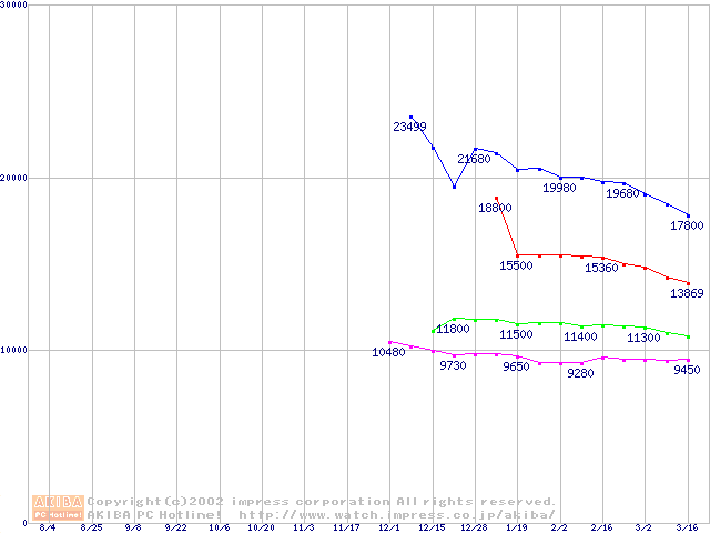 | [↑前グラフ]: | Deskstar 60GXP (7200rpm,UltraATA/100 2MB)の最安値推移 |