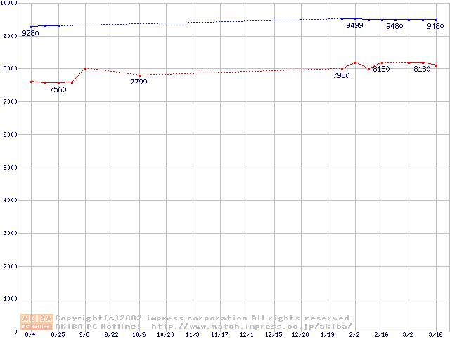| [↓次グラフ]: | WD Caviar(Special Edition) (7200rpm,UltraATA/100,8MB)の最安値推移 |