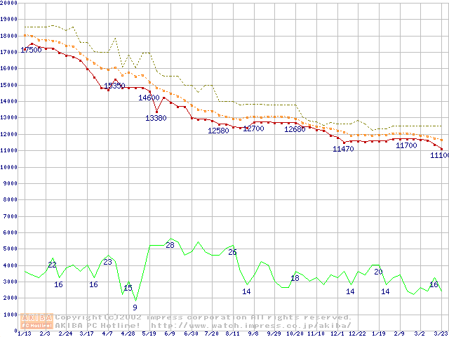 WD Caviar (7200rpm,UltraATA/100,20GB/Platter)の最安値推移